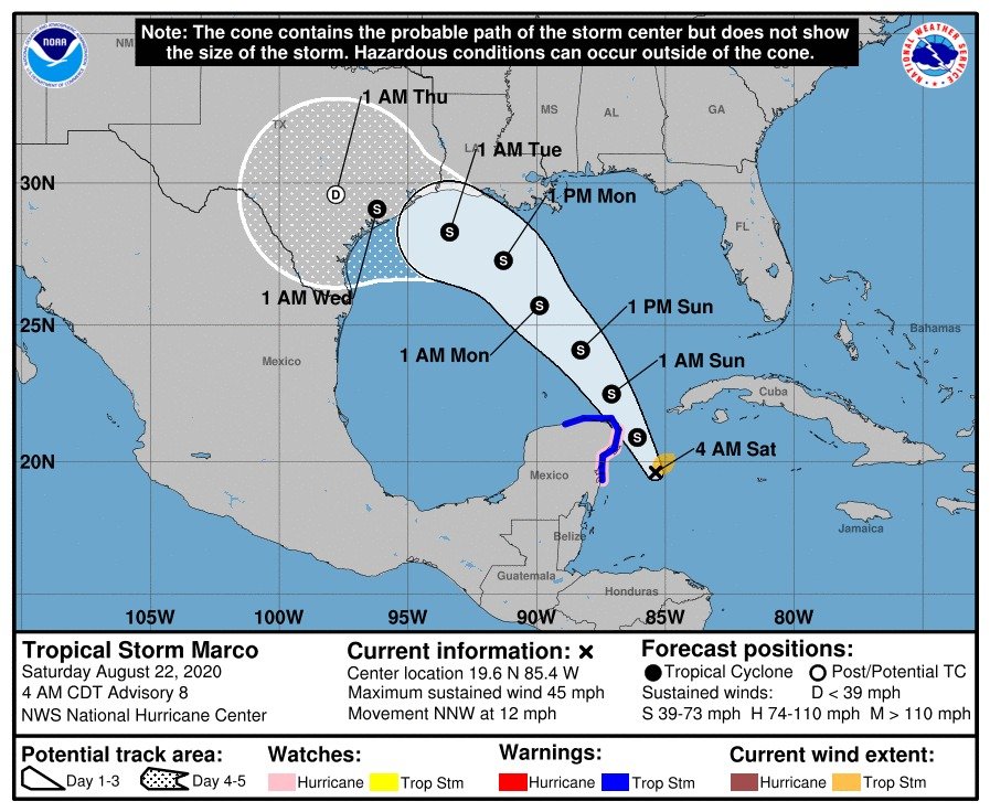 La Tormenta Tropical «Marco» localizada aproximadamente a 185 kilómetros al este-sureste de Cozumel, tiene vientos máximos sostenidos de 75 kph, y su movimiento es hacia el noroeste; su presión mínima central de 1,005 milibares; se estima continúe su trayectoria hacia Isla Mujeres en las primeras horas de mañana, cruzando al este de Cozumel a unos 30 o 40 km este día por la tarde entre las 14 y15 horas afectando el cuadrante número cuatro con vientos de 80 a 90 kph con rachas de 110 kph con numerosos chubascos y tormentas eléctricas dispersas, una precipitación para este día de 55 a 70 milímetros con oleaje de 6 a 8 aumentando a 11 y 17 pies en el canal de Yucatán para este día.